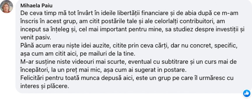 În calitate de coach trainer financiar, am lucrat cu peste 9000 de persoane în ultimii 8 ani, oferind comunității atât expertiza mea, cât și expertiza celor mai buni specialiști pe care i-am putut găsi pe piață, în aria de finanțe personale și investiții.